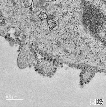 香港大學電子顯微鏡圖像顯示了在細胞中生長的新型冠狀病毒。