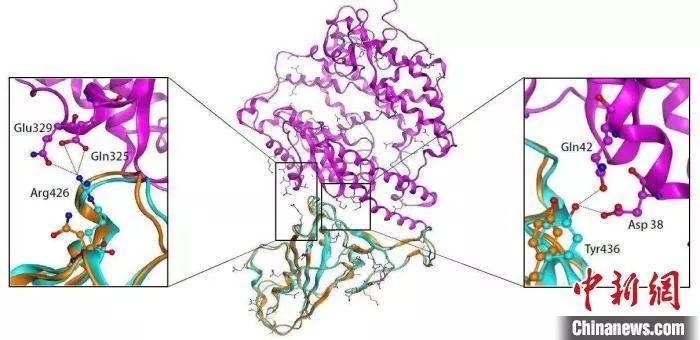 計算機模型:病毒S蛋白與人ACEⅡ蛋白結(jié)合示意圖 中科院上海巴斯德所/供圖
