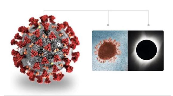 美國疾病控制中心(CDC)則創造出了一個可視化新冠病毒立體模型,結合了新冠病毒在顯微鏡下的形態以及日食的圖像。