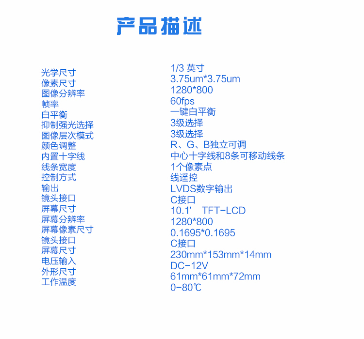 首頁 / 產品展示 / 顯微鏡附件 / 相機 / 10.1英寸帶屏工業相機(HDMI-10P)